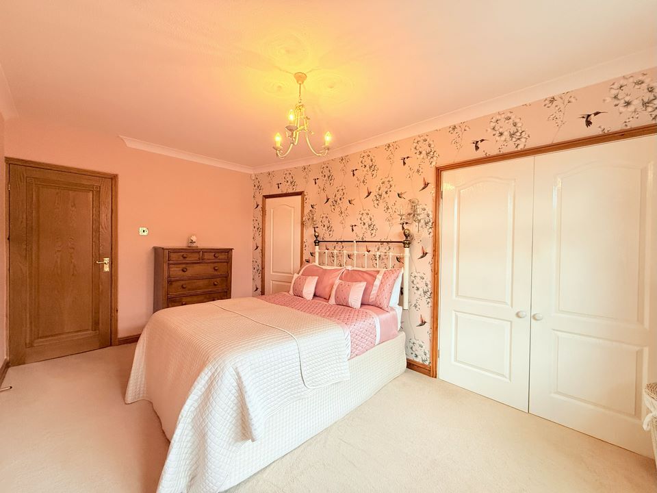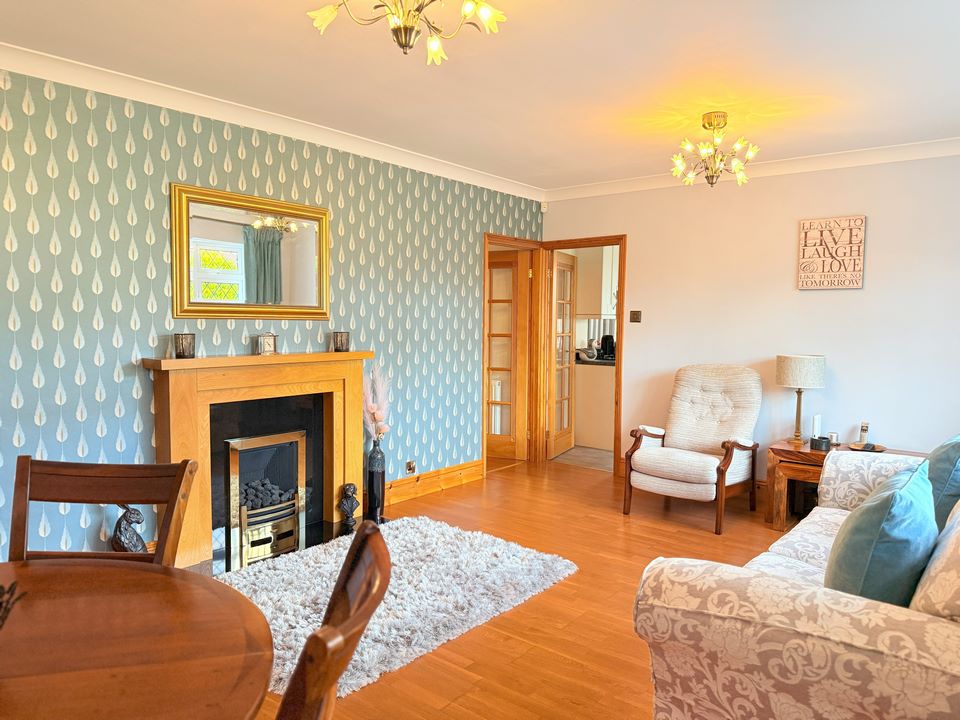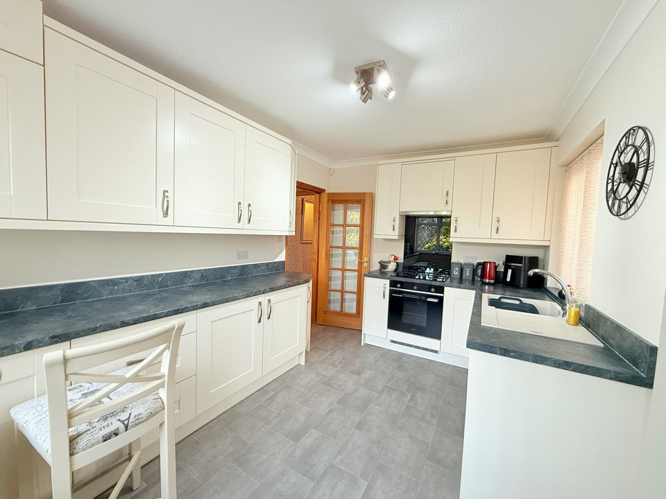 On entry, you are welcomed via an entrance porch that opens into the front living room a bright and spacious reception area that sets the tone for the home. This flows seamlessly into the fitted kitchen, complete with matching base and wall units, integrated oven, gas hobs, and a side door providing access to both the front and rear gardens.