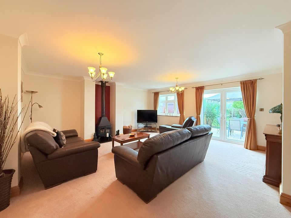 To the rear, the property truly comes into its own, benefitting from an extension that creates a second reception room of remarkable size. Featuring a log burner as a central focal point, this impressive living space is ideal for both family gatherings and entertaining. French doors open directly onto the rear garden, blending indoor and outdoor living.