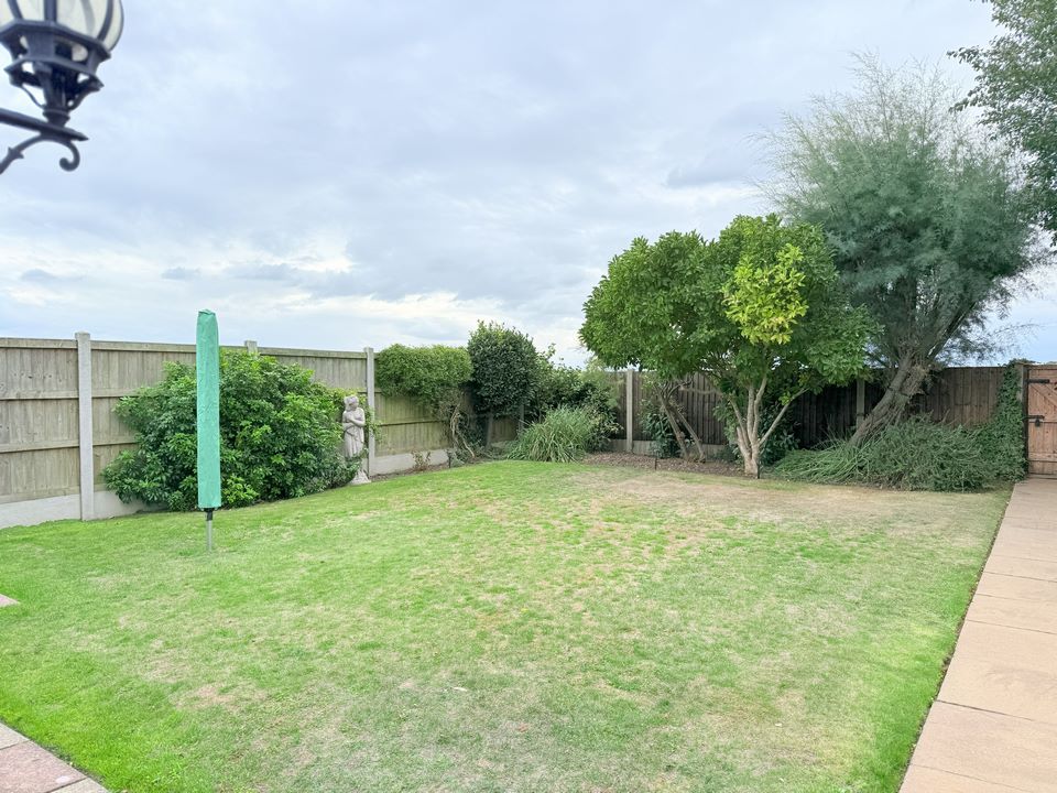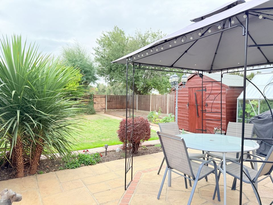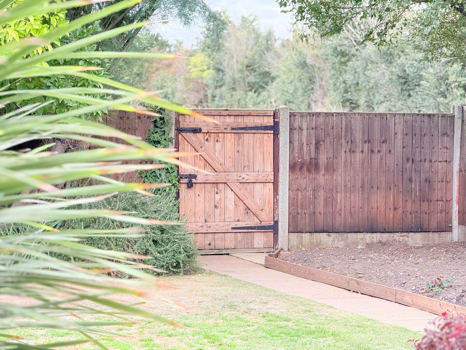 The garden itself begins with a paved patio, perfect for seating or dining, before extending into a larger lawned area. Timber sheds, a garden greenhouse, and mature planting provide further versatility, while the property backs onto open fields, ensuring a beautiful and peaceful outlook across unspoiled greenery.