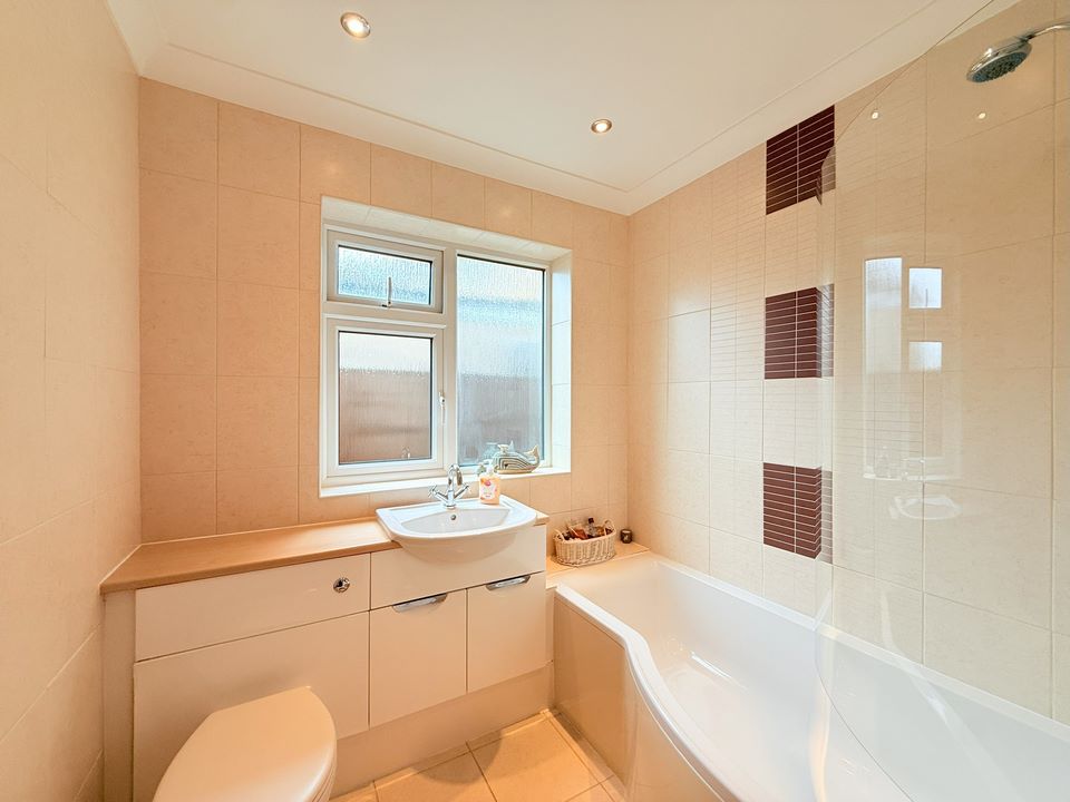 Low flush wc, hand wash basin, obscure double glazed window, bath with overhead buit in wall shower,