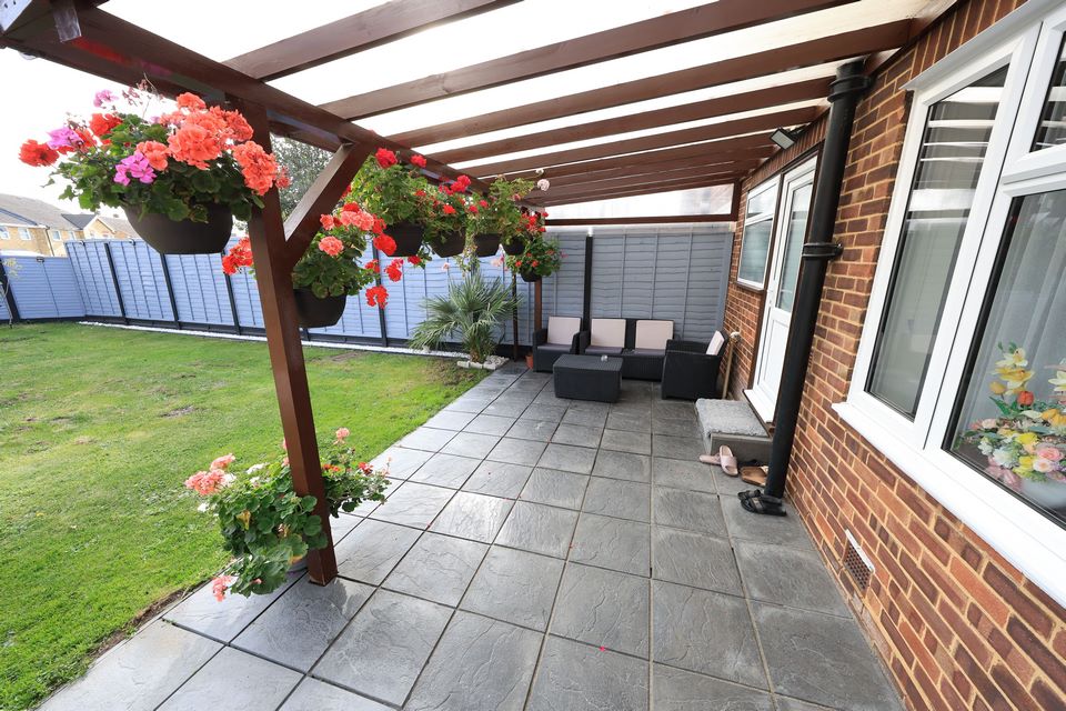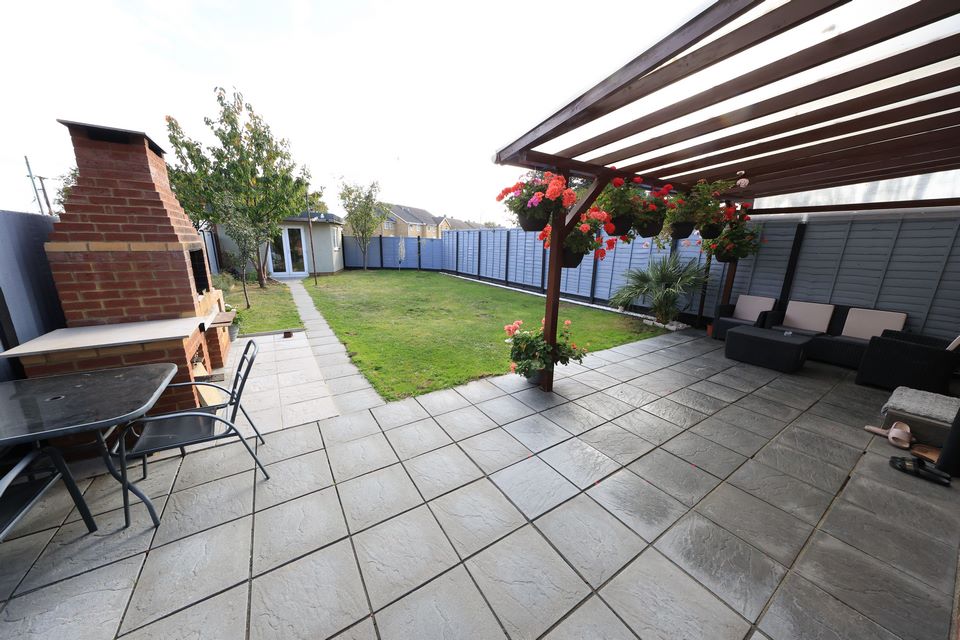 Patio area, sheltered pergola, outside tap, gated pedestrian side access, brick built barbeque, brick and