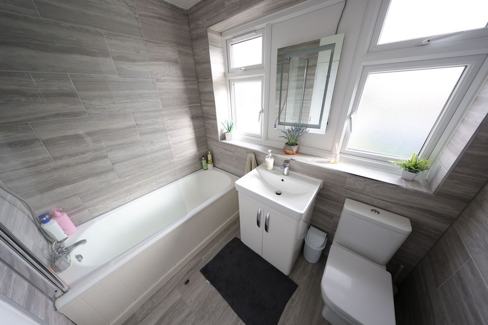 Obscure double glazed window to rear, bath with mixer tap and shower attachment, glass shower screen,