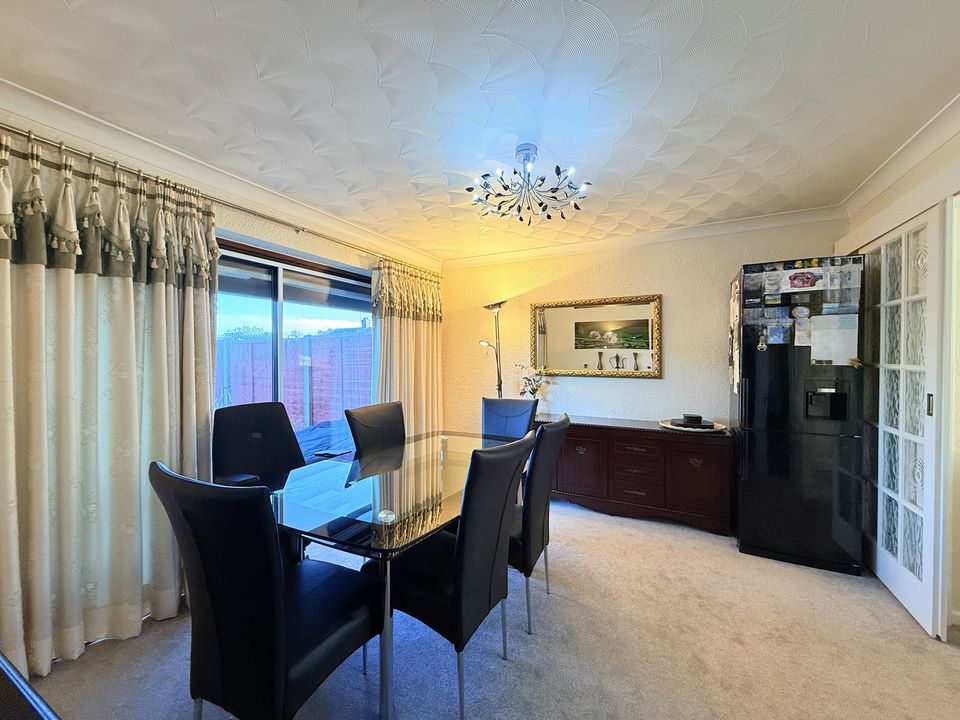 Stepping inside, you are welcomed via an entrance porch which opens into a central hallway. The ground floor accommodation comprises a bright and well-proportioned lounge flowing through to a dining area, creating an ideal space for both everyday living and entertaining. Connected at the rear, the spacious kitchen is fitted with a range of matching base and wall units and provides direct access to the rear garden. Completing the ground floor is a cloakroom and the converted garage, currently utilised as a playroom but offering excellent flexibility.