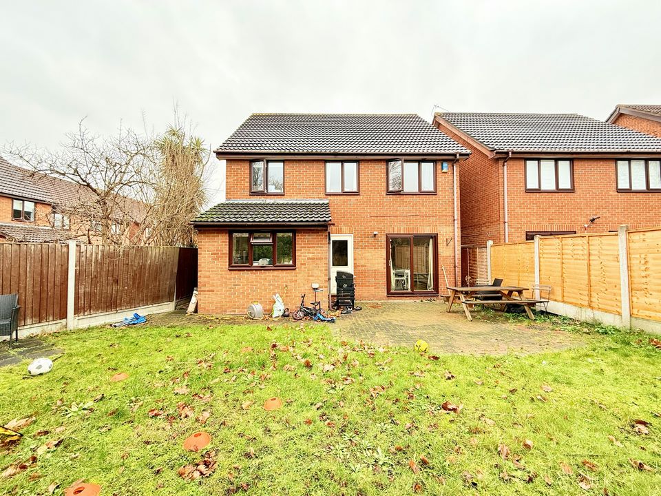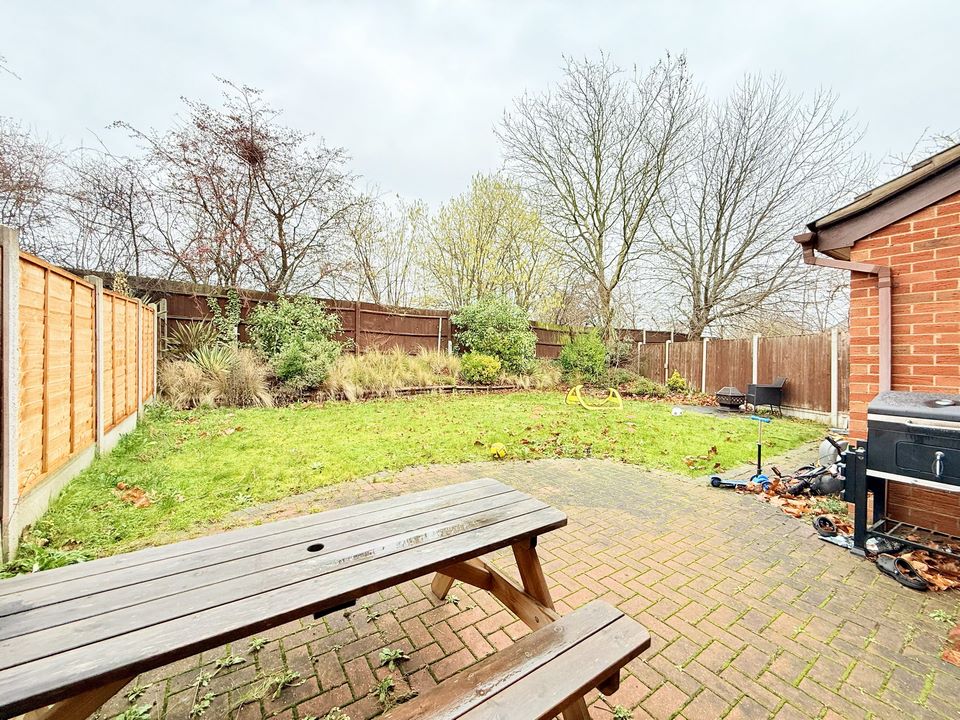 Immediate paved patio area, rear boundary shrubs, remainder laid to lawn, gated pedestrian side access