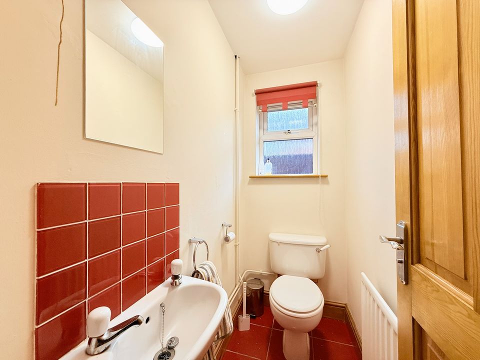 Low flush wc, tiled flooring, hand wash basin with tiled splashbacks , obscure double glazed window to