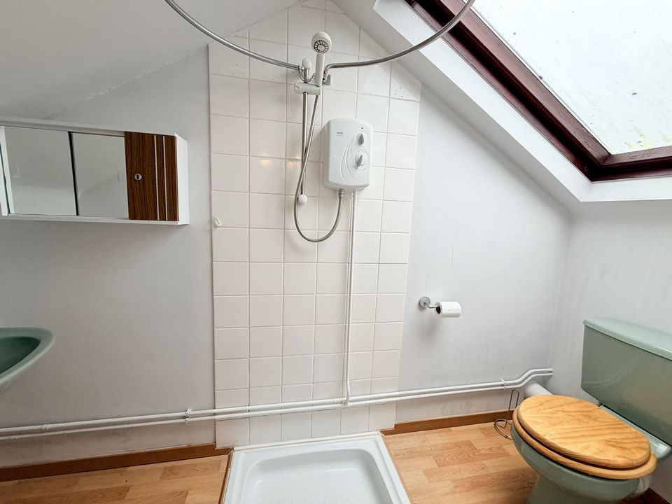 Velux window to rear, low flush wc, shower tray, radiator, wood effect laminate flooring, tiled