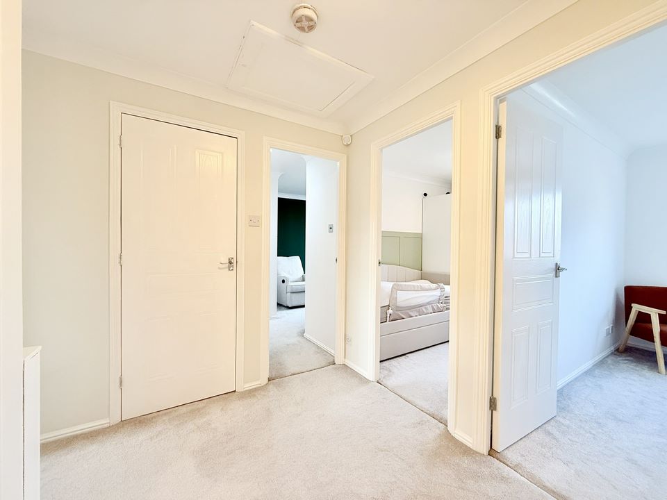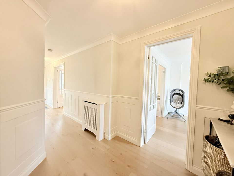 To the first floor, a wraparound staircase leads to a spacious landing that connects all four bedrooms and the family bathroom. The principal bedroom and second bedroom both benefit from built-in wardrobes and their own en-suite shower rooms, while the remaining bedrooms are well proportioned and versatile for family use, guest accommodation, or home working. In addition, the principal bedroom has a dedicated heat pump air conditioning unit providing personalised climate control, creating a comfortable retreat in all seasons. The family bathroom is fitted in a modern style and serves the remaining bedrooms.