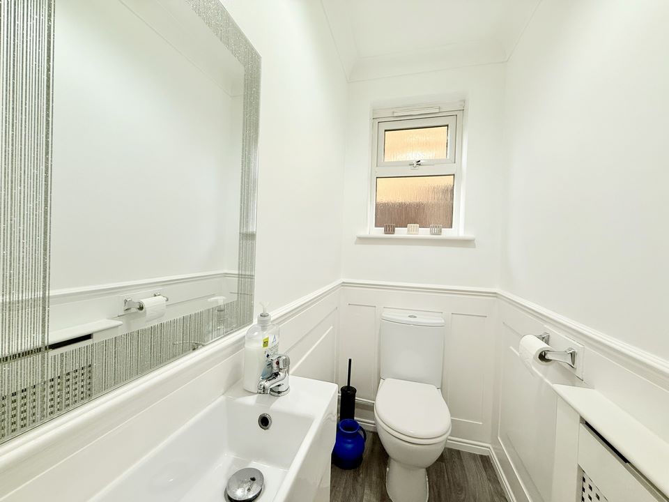 Obscure double-glazed window to front, low flush wc, hand wash basin with tiled splashbacks, enclosed