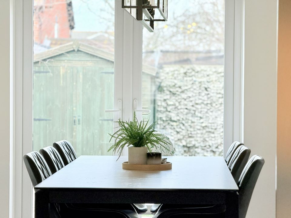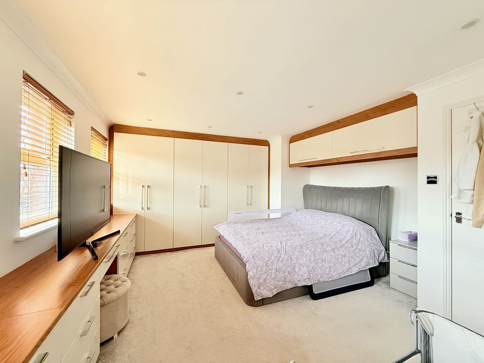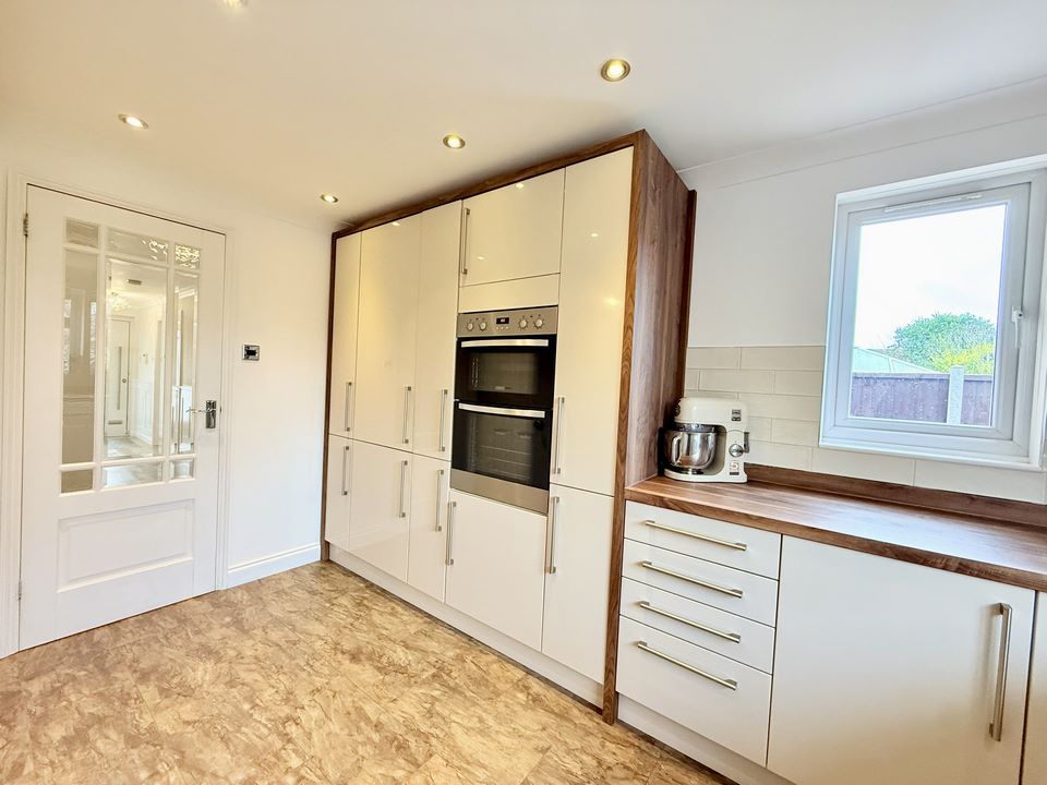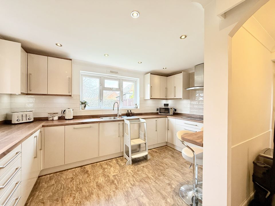 Further ground floor accommodation includes a modernised downstairs cloakroom and internal access to the integral garage, offering practical storage or potential for alternative uses, subject to individual requirements & approval. Completing the ground floor is a stylishly refitted kitchen, fitted with matching base and wall units and a full range of integrated appliances, including oven, grill, fridge freezer, induction hob, dishwasher, and extractor. The kitchen is complemented by a separate utility area with additional worktop space, plumbing for appliances, housing for the boiler, and a composite stable-style side door providing external access to the garden.