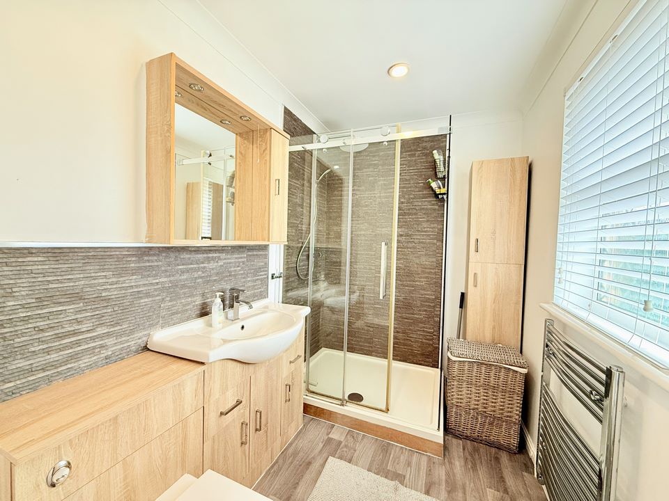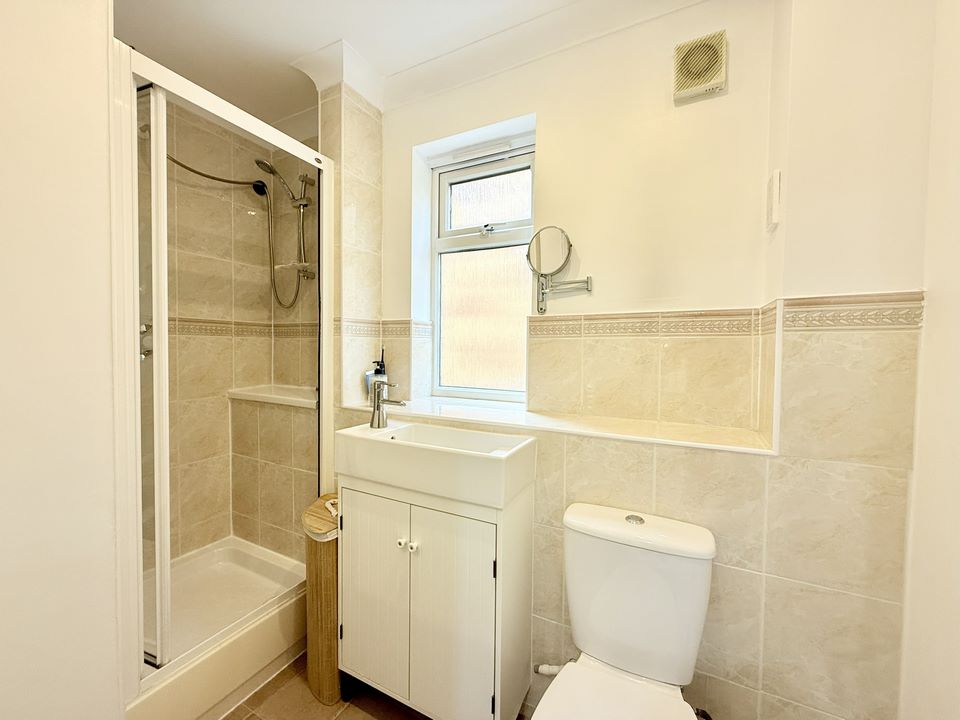 Double glazed window to side, low flush wc, hand wash basin, enclosed shower cubicle, partly tiled