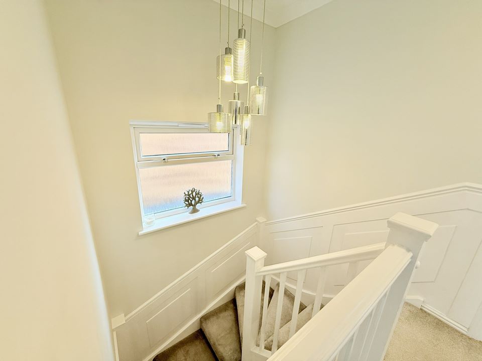 Stairs leading down to ground floor hallway, loft hatch (loft ladder installed), obscure double glazed