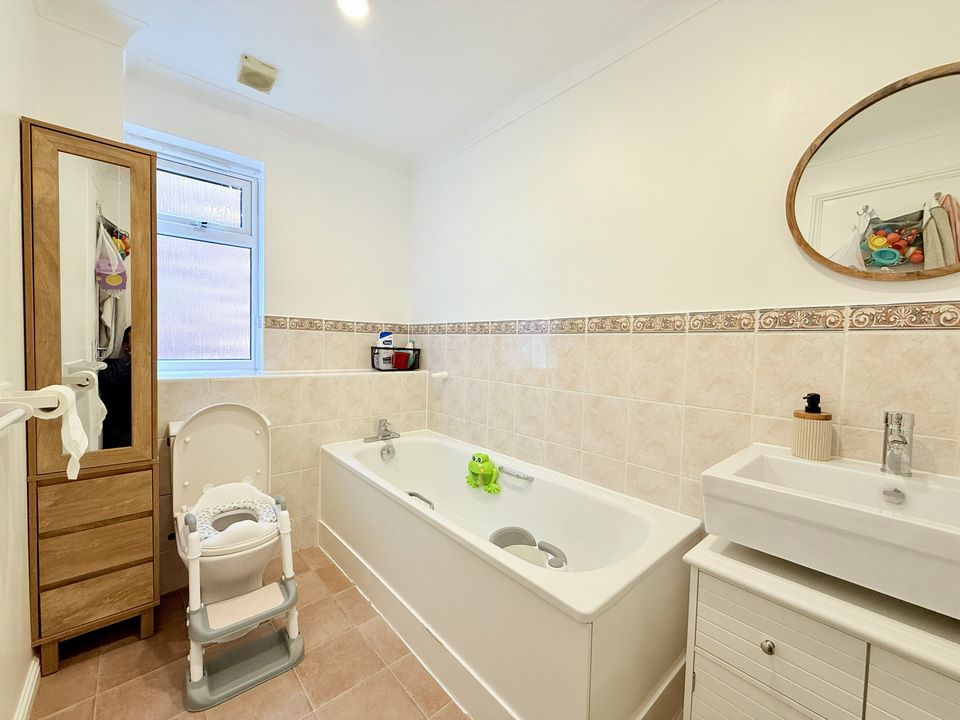 Obscure double-glazed window to side, low flush wc, bath with mixer tap, hand wash basin, wall