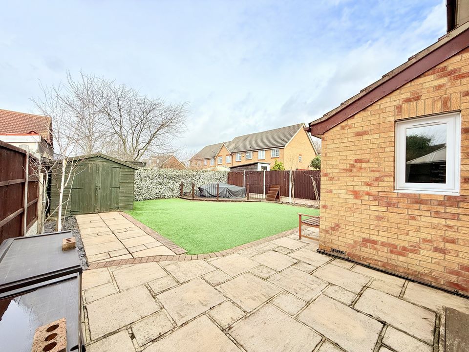Approximately 38ft in depth, immediate paved patio, artificial grass, timber shed, decking area to rear