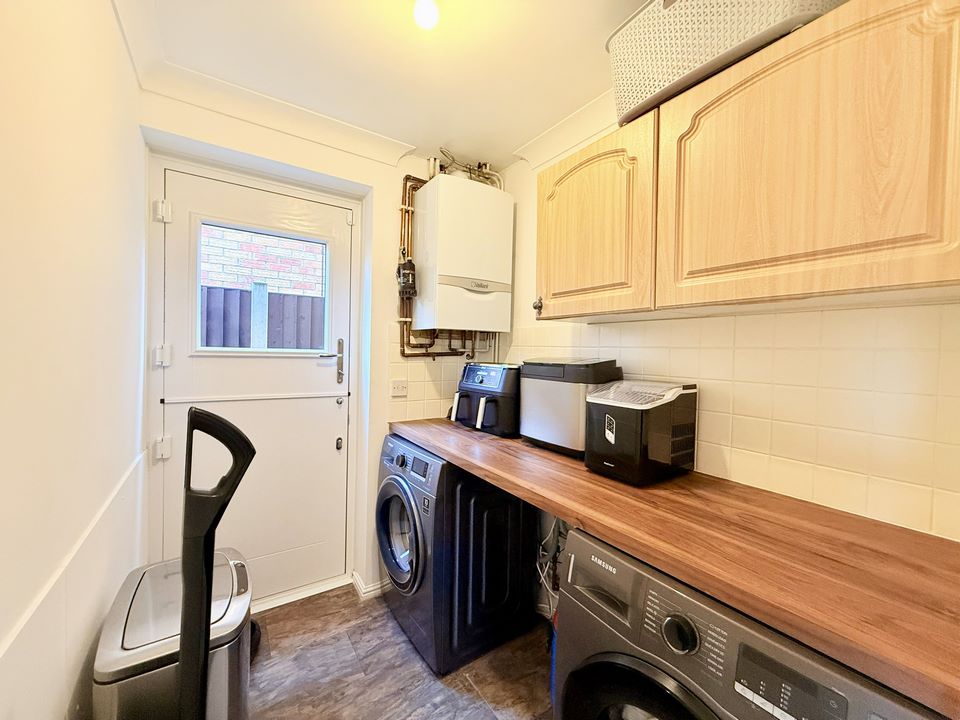 Work top space, plumbing for appliances, boiler, composite stable style door to side providing access to