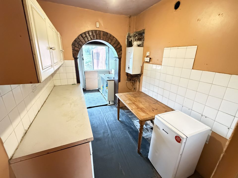 Single glazed windows to rear, door to garden, stainless steel sink and drainer